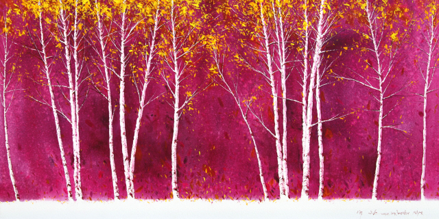 특히 자작을 그린 시리즈 ‘자작, 하얀 영혼의 실루엣’에 계절감과 다양한 구도가 뚜렷하게 드러난다. 푸른 하늘과 흰 자작의 대비, 강렬한 자줏빛을 배경으로 서 있는 자작, 노랑과 초록으로 싱그러운 자작 등이